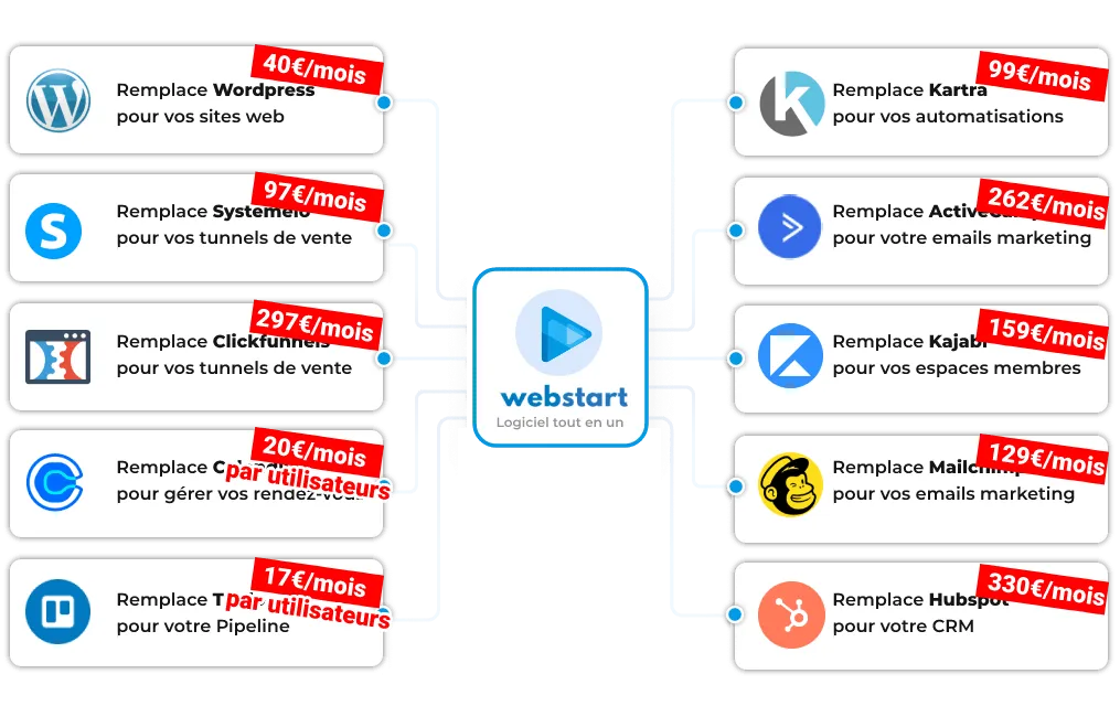Hébergement, construction de funnels, campagne d'e-mailing, automation, affiliation, SMS marketing, pipelines, CRM, créations d'espaces membres, calendly intégré, avec une application mobile et d'autres fonctionnalités innoventes...